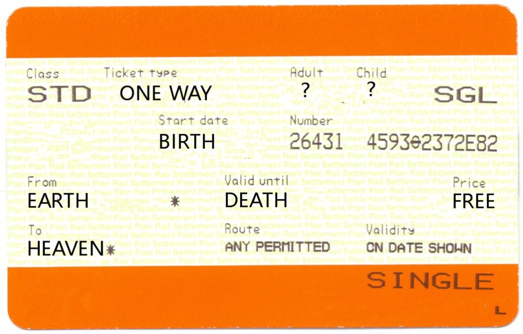 So I ask you, before you die, “Would you like a one way ticket?” Oh, and by the way, no charge. Jesus paid the price for you when he died on the cross.